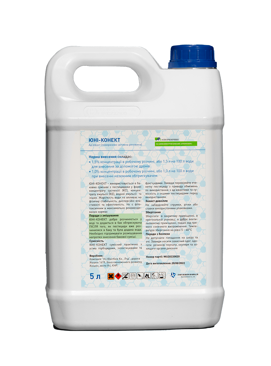 ЮНІ‑КОНЕКТ добре розчиняється у воді та додається в бак обприскувача ПІСЛЯ того, як пестициди вже розчинилися у баку та була додана вода. Необхідно підтримувати розмішування протягом внесення бакової суміші.