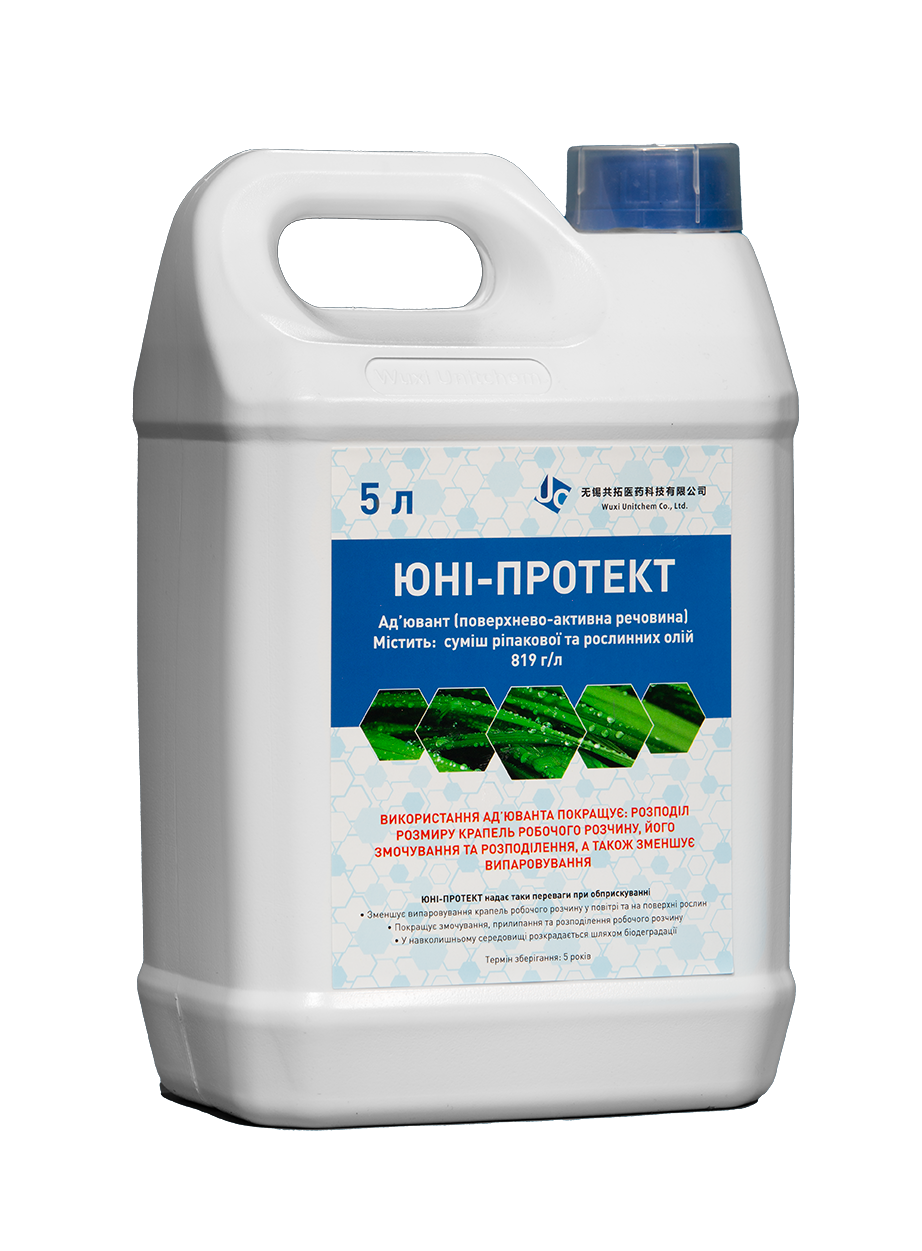 ЮНІ‑ПРОТЕКТ добре розчиняється у воді та додається в бак обприскувача ПІСЛЯ того, як пестициди вже розчинилися у баку та була додана вода.