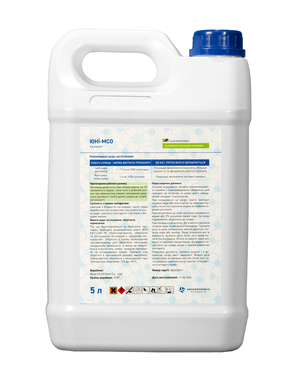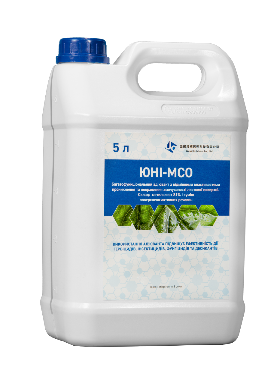 ЮНІ-МСО призначений для заміни не-іонних поверхнево-активних речовин і концентратів рослинної олії в програмах внесення робочих сумішей для обприскування.