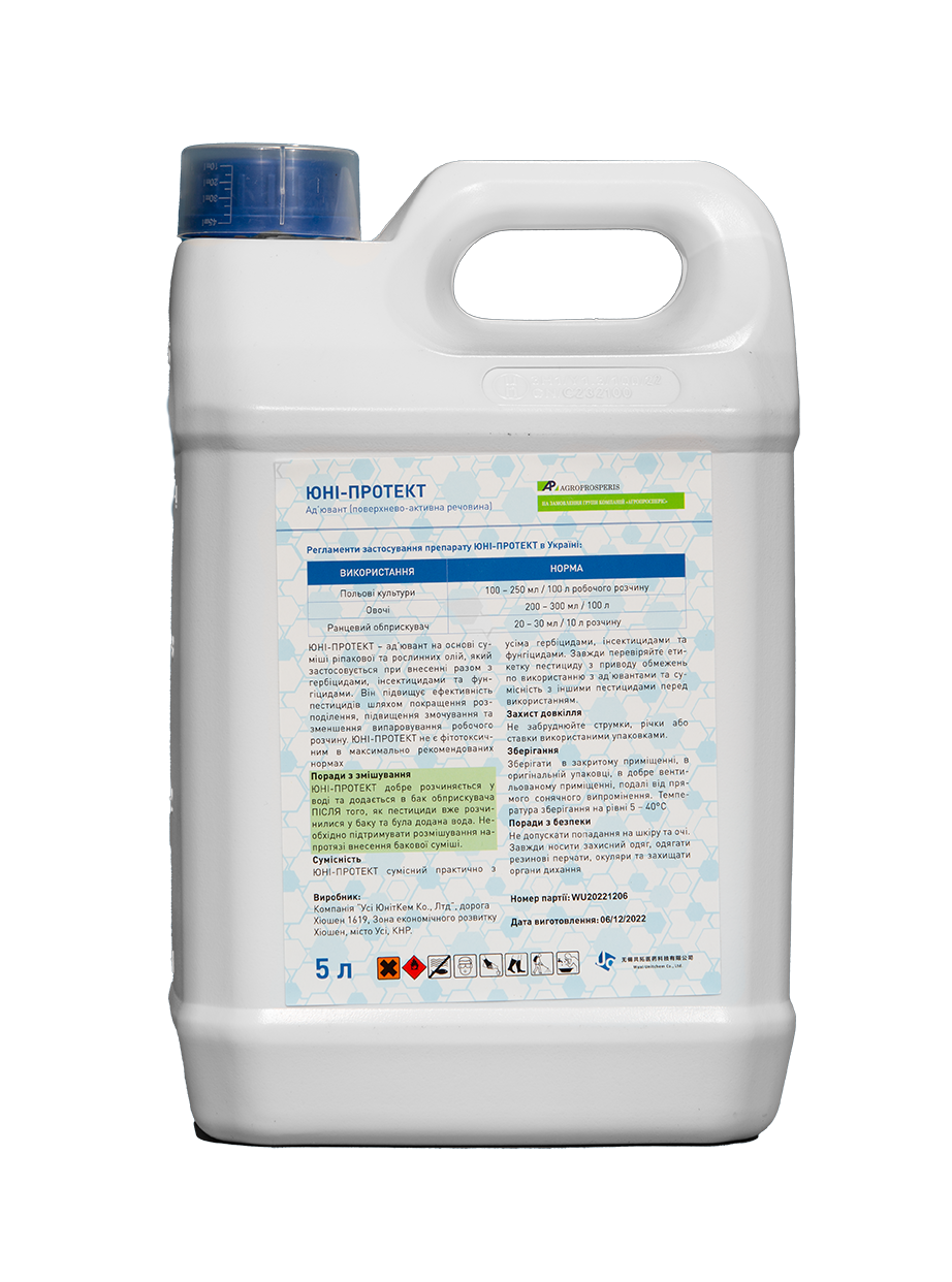 ЮНІ‑ПРОТЕКТ добре розчиняється у воді та додається в бак обприскувача ПІСЛЯ того, як пестициди вже розчинилися у баку та була додана вода.